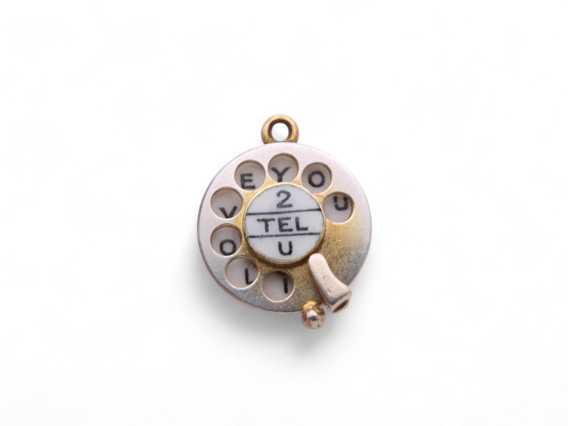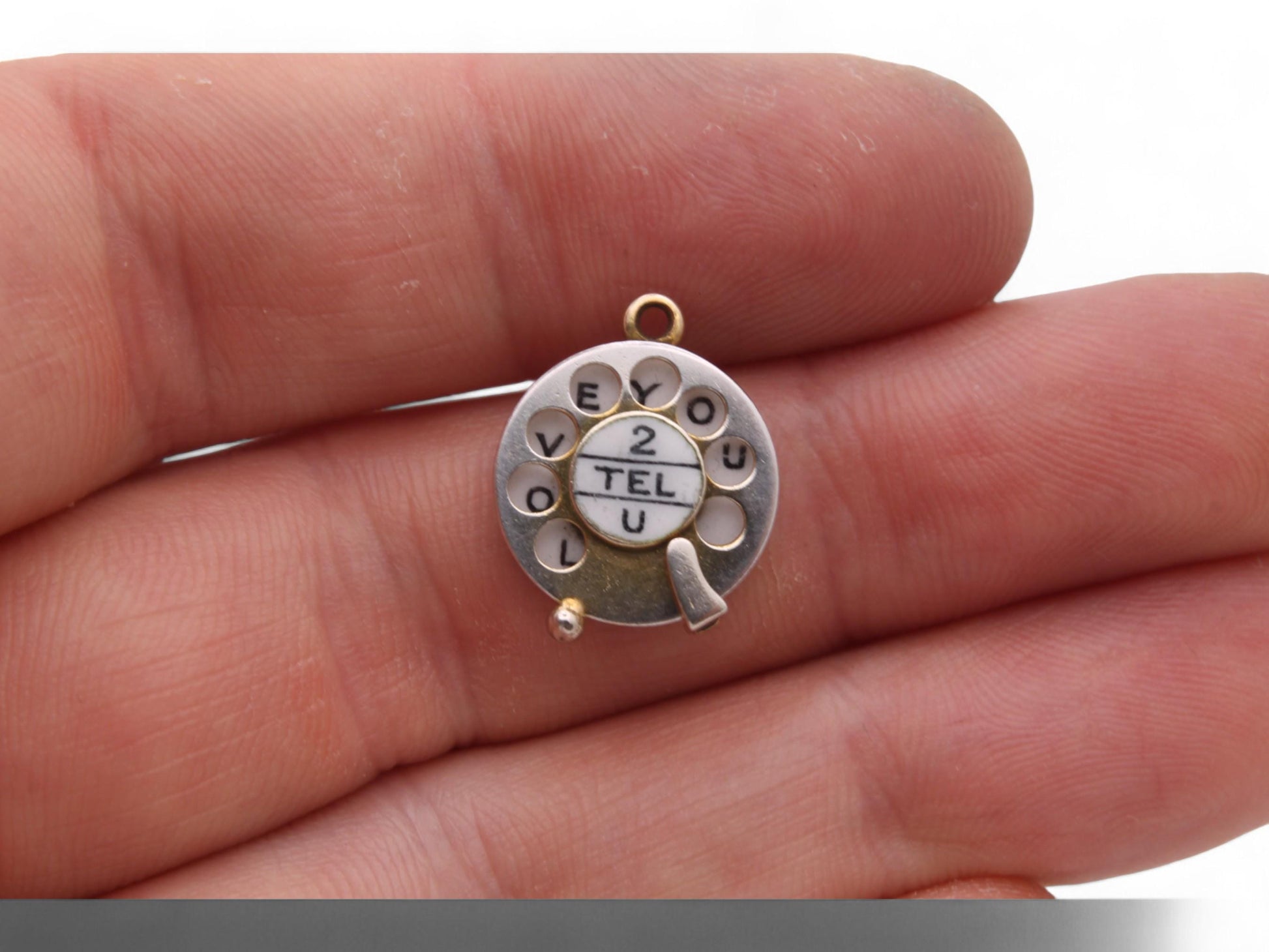 A delightful vintage 9ct gold charm, designed as an old-fashioned dial telephone wheel. This charming piece is beautifully enamelled with the playful phrase "2 tel you" at its centre. A unique feature of this charm is its rotatable dial and holes, which reveal the heartfelt message "I love you" as you turn it.