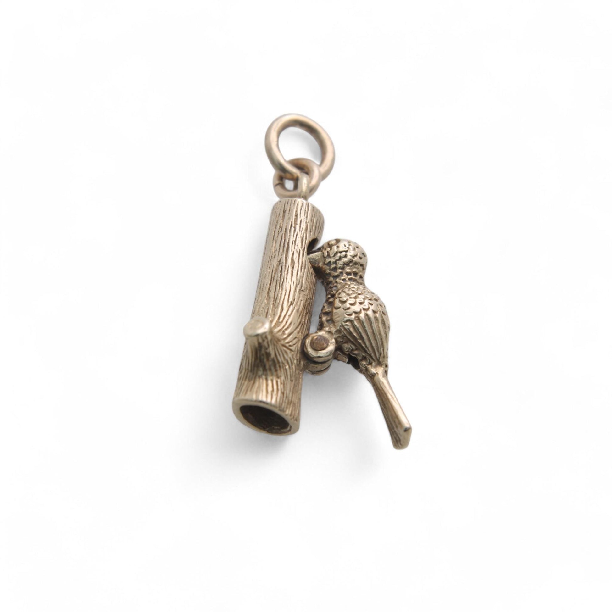 This delightful vintage 9ct gold charm captures the charm of nature with its playful and intricate design. Featuring a beautifully detailed woodpecker perched on a tree, the charm comes to life with a unique moving mechanism that allows the woodpecker's beak to peck in and out of the tree. The tree stump showcases fine detailing, adding texture and realism to the piece.