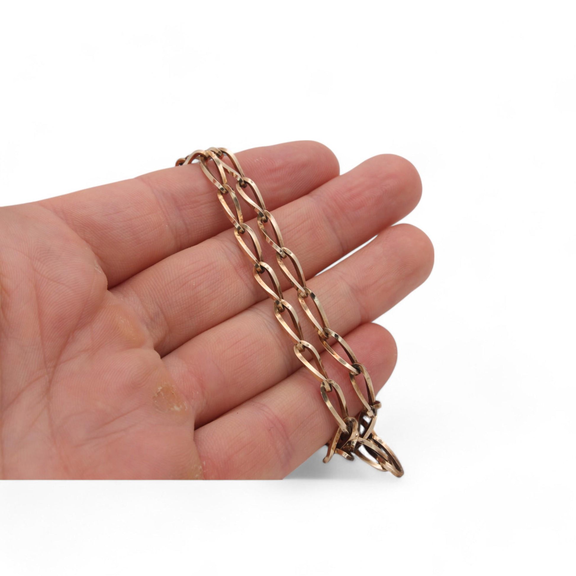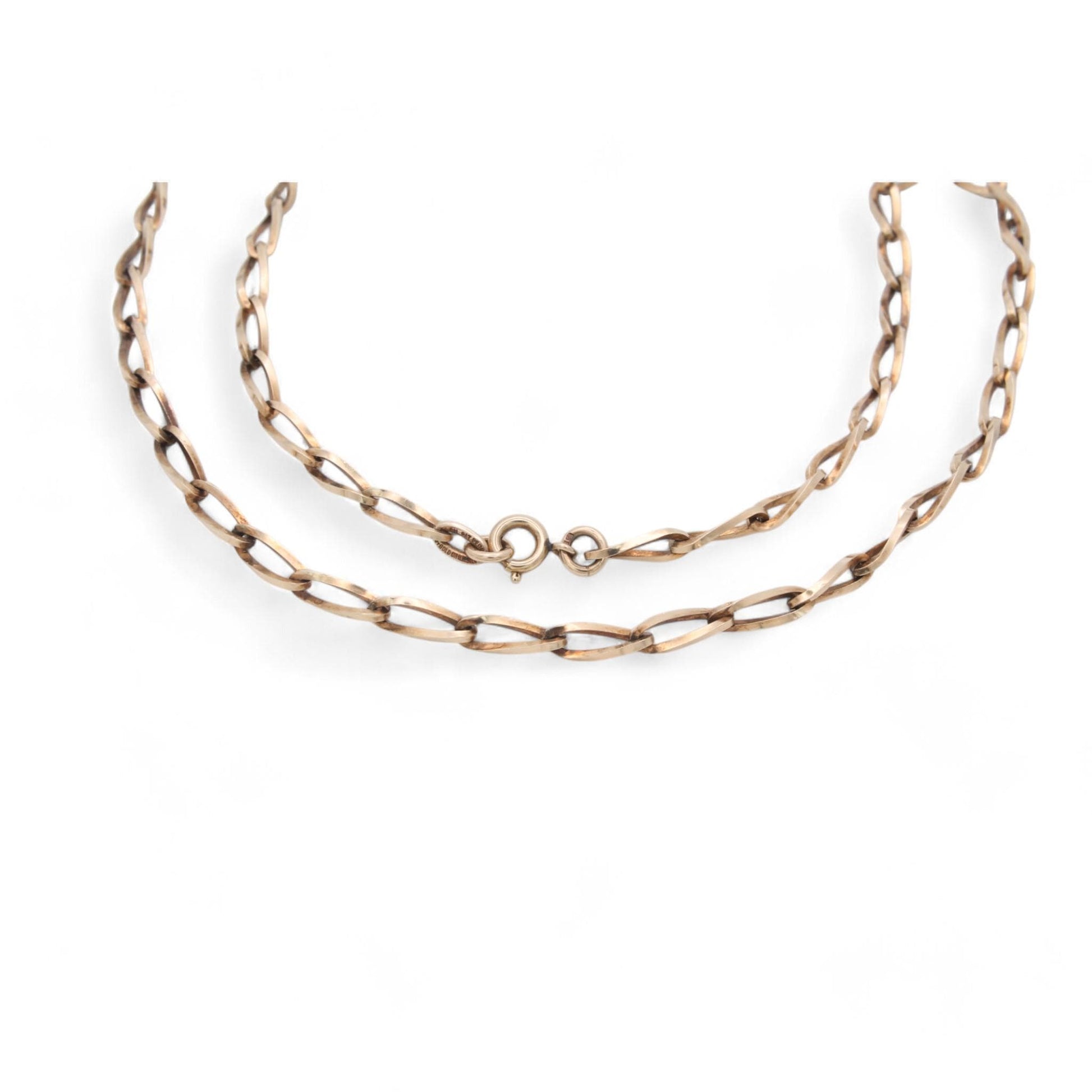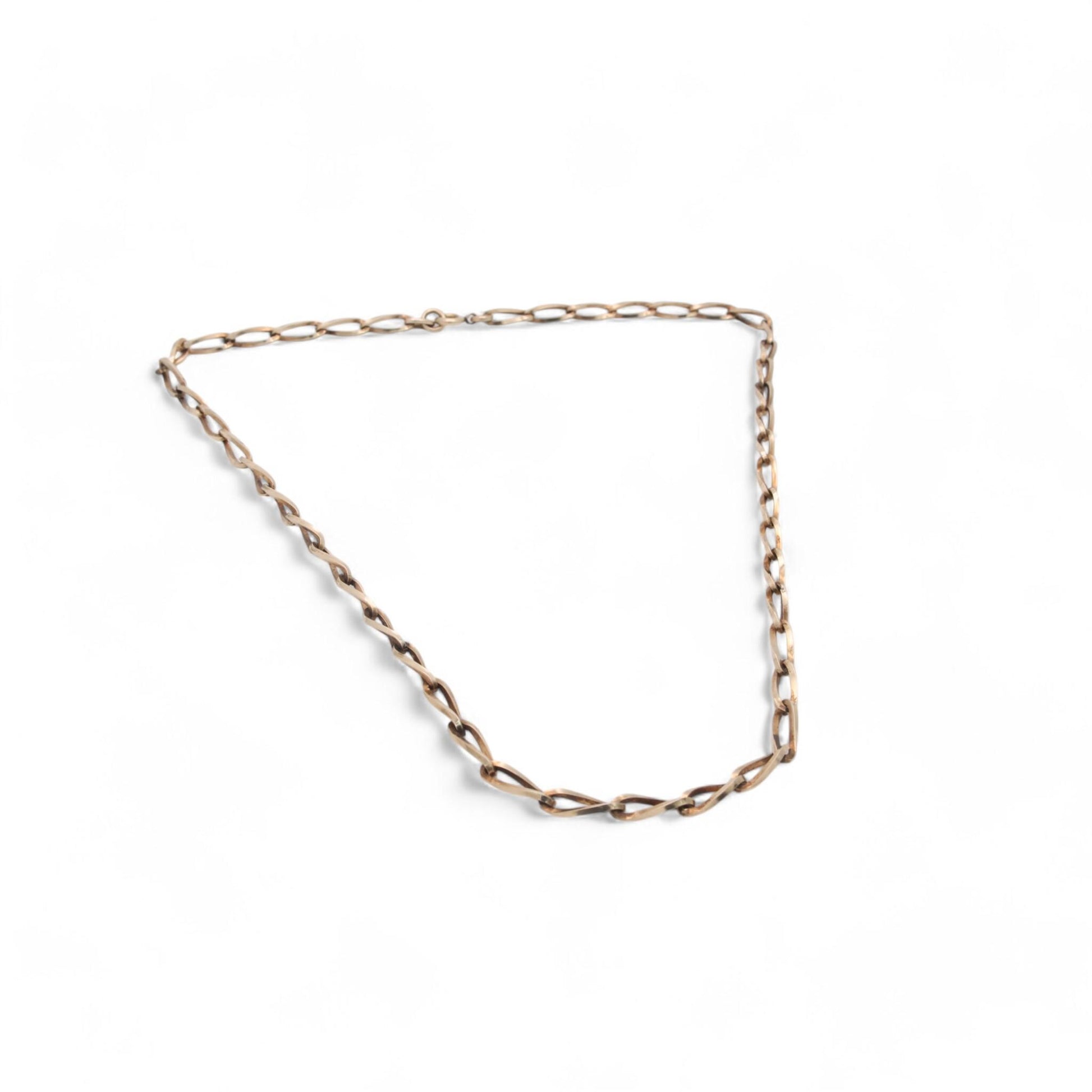 This vintage 9ct gold on silver necklace, dating to 1985, is a beautiful blend of elegance and timeless style. The necklace features twisted trombone links, creating a unique texture and visual interest that catches the light with every movement.