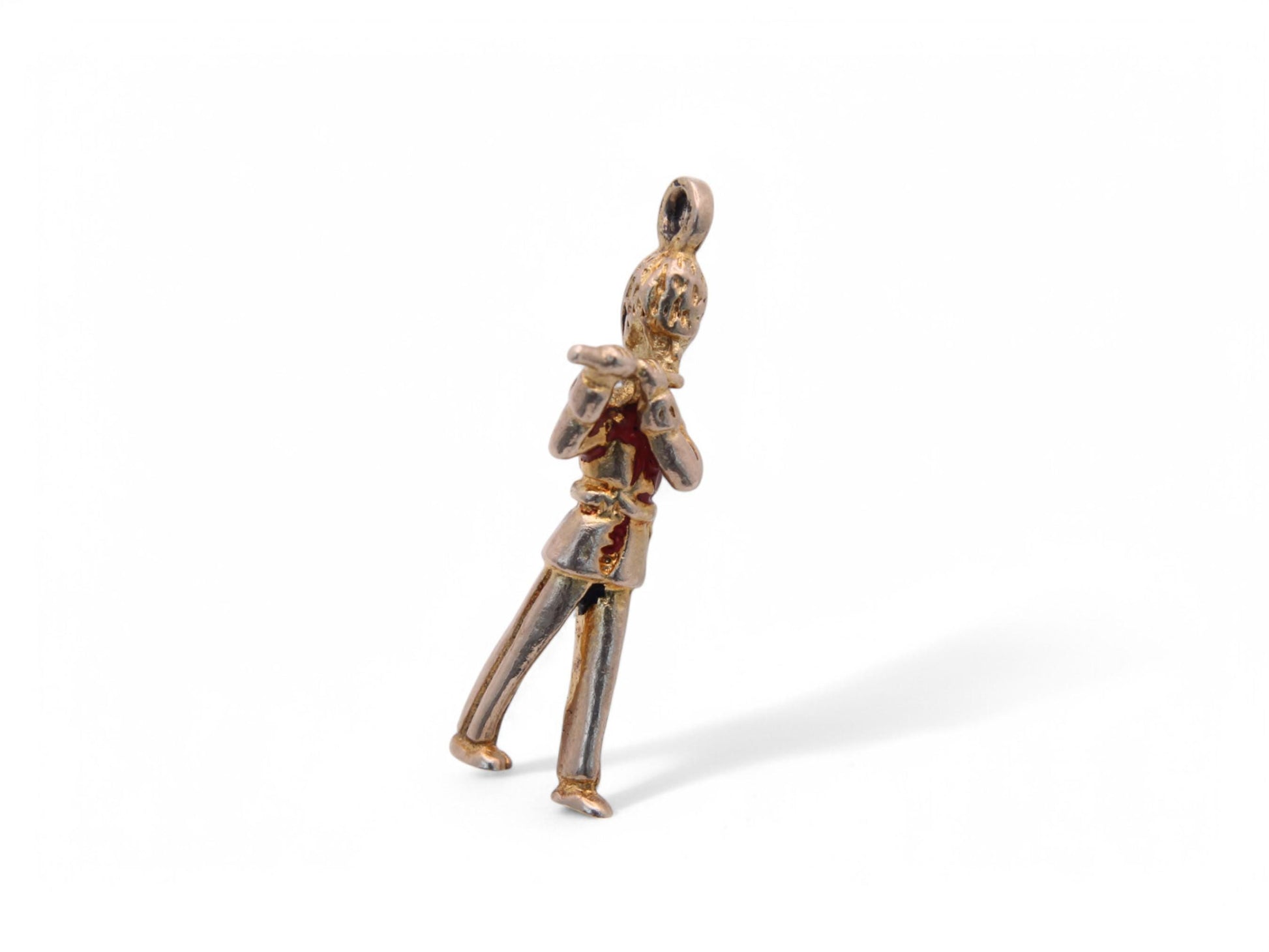 A delightful vintage 9ct gold charm modelled as a Queen’s Guard for Buckingham Palace, playing a flute. Crafted in solid gold, this highly detailed miniature figure captures the charm and tradition of the British royal guard. Hallmarked and dating to 1970, it's a whimsical and collectible piece perfect for any charm bracelet or as a pendant.