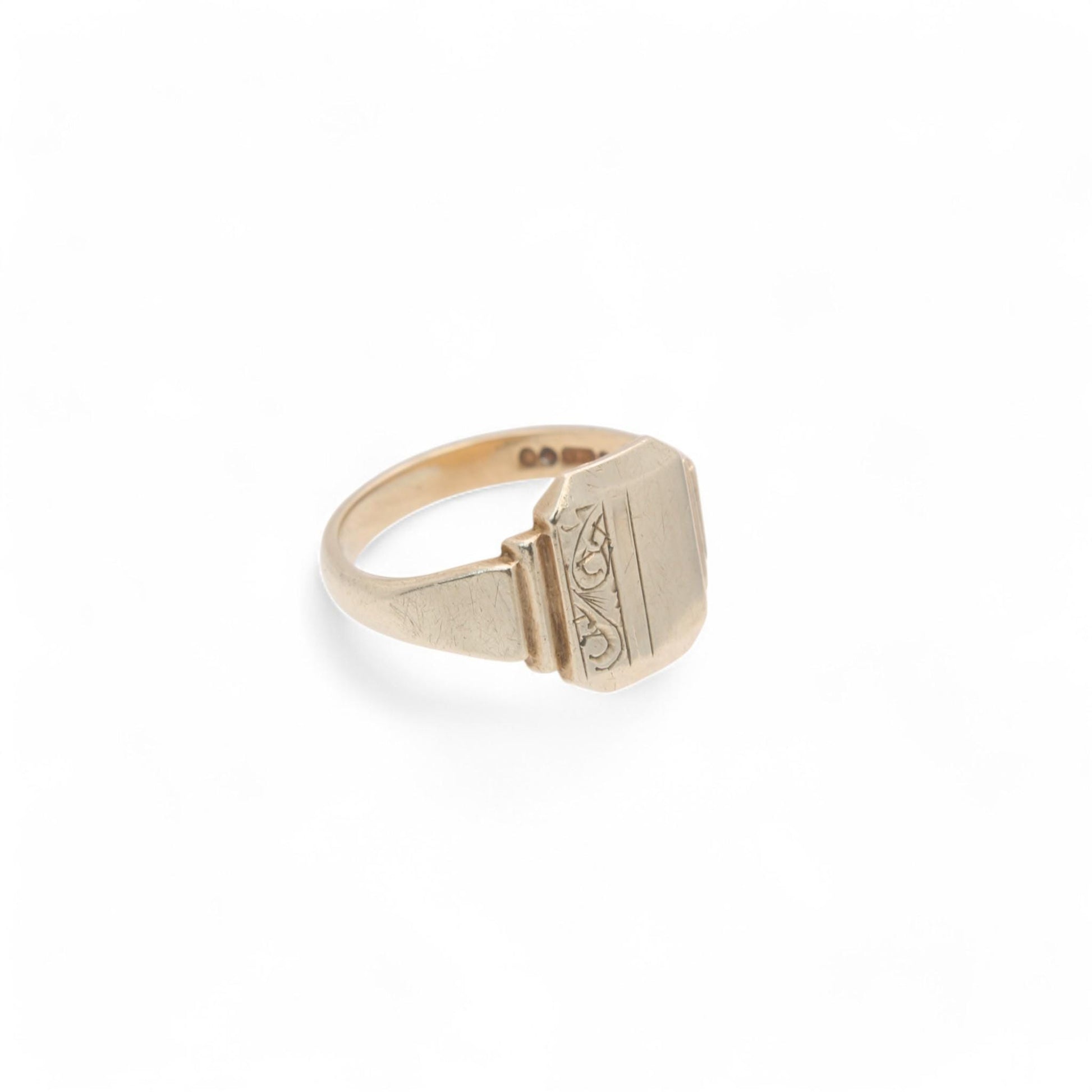 This vintage 9ct yellow gold signet ring, dating to 1967, features a beautifully engraved face. The engraving covers half of the face, adding an elegant touch to the classic signet style.