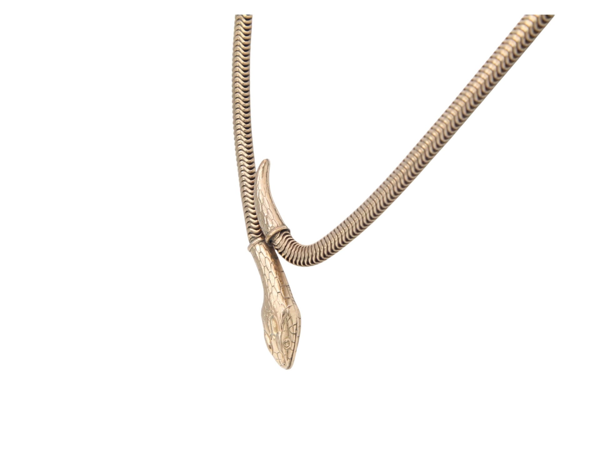 A striking vintage snake necklace crafted in 9ct rolled gold, with fluid snake-link chain and a finely detailed snake head and tail. The head and tail meet at the front to form a bold focal point, showcasing the symbolic beauty of the serpent. The craftsmanship and elegant design capture both nature’s mystique and the timeless charm of vintage jewellery.