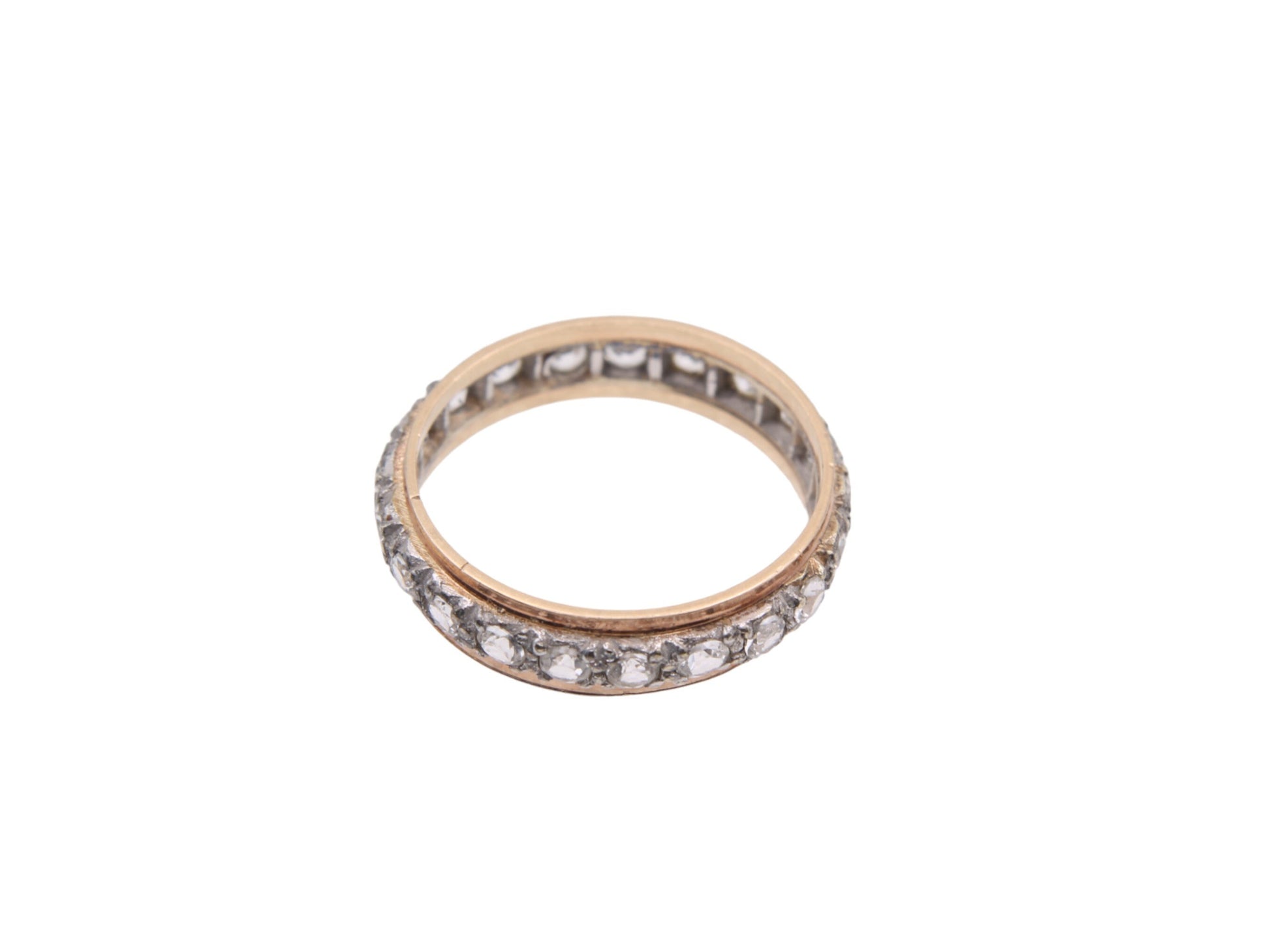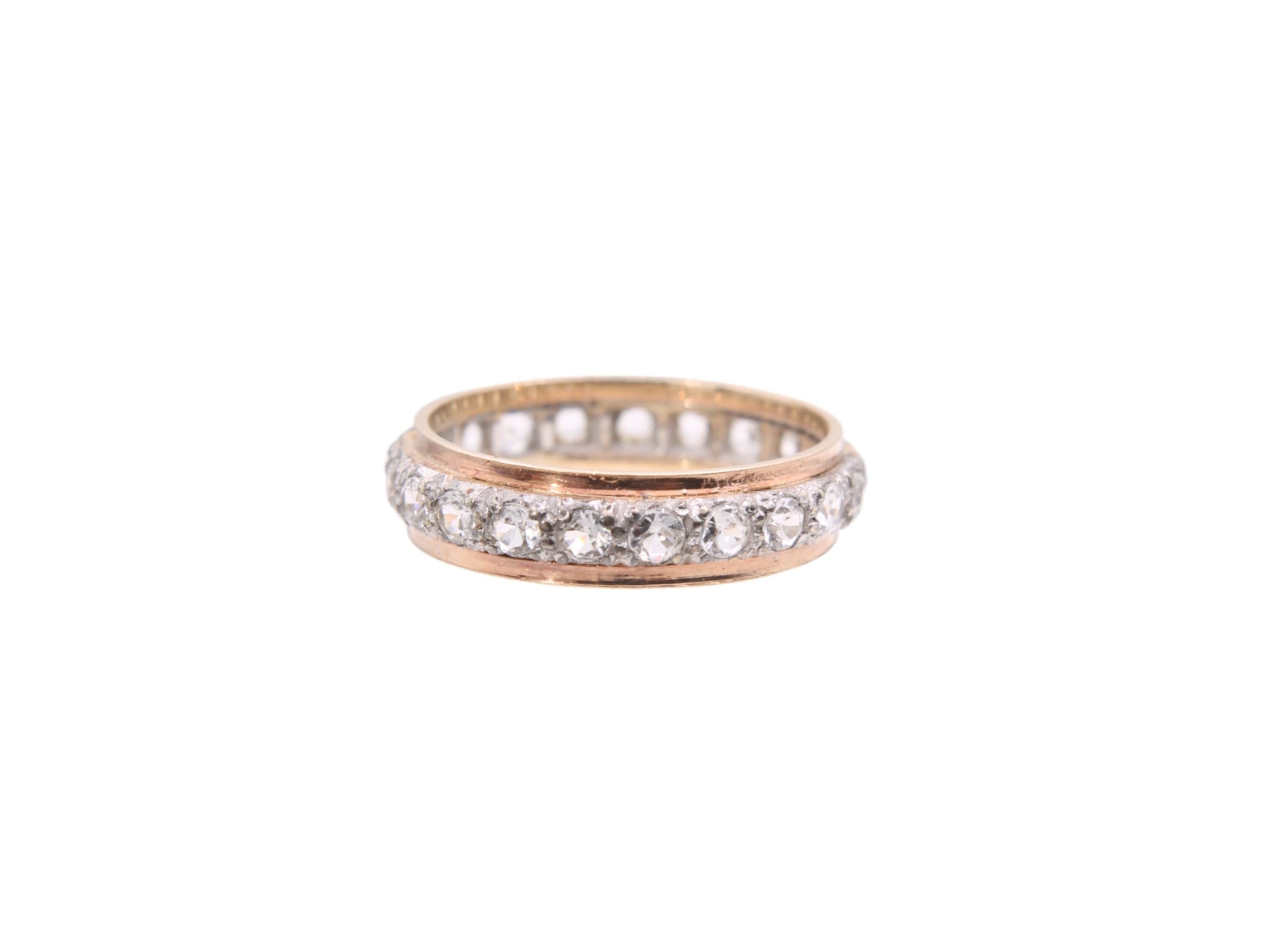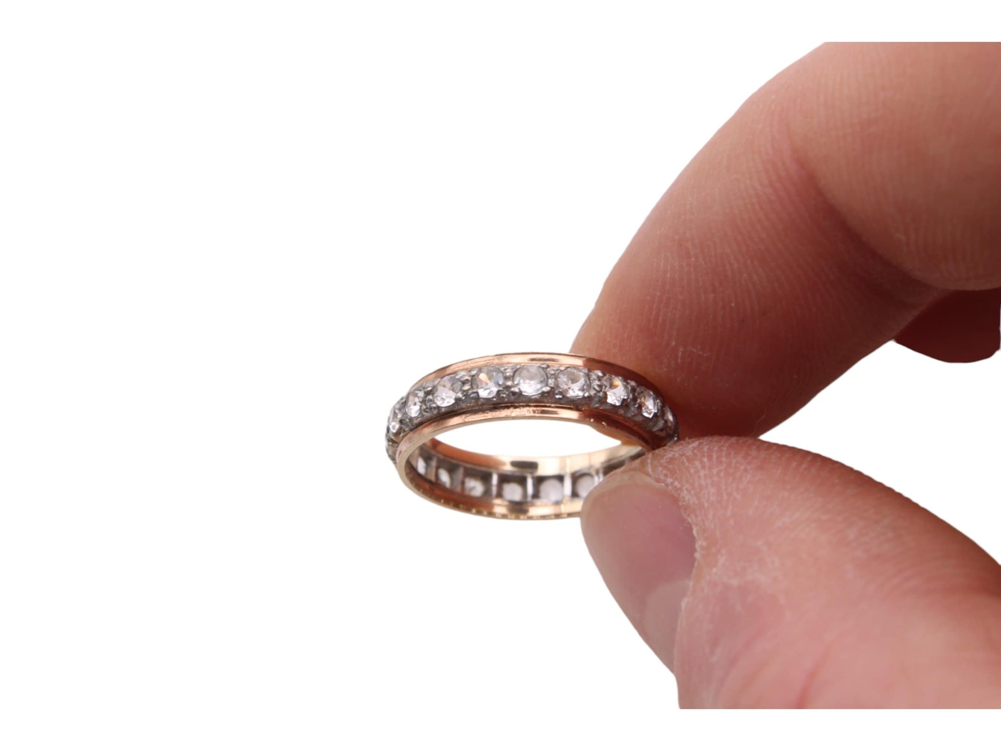 A Vintage 9ct Gold Eternity Band, adorned with meticulously set paste stones. Crafted from high-quality 9ct rose gold, this timeless piece radiates a warm and luxurious glow, accentuating the brilliance of the carefully chosen paste stones that encircle the band.